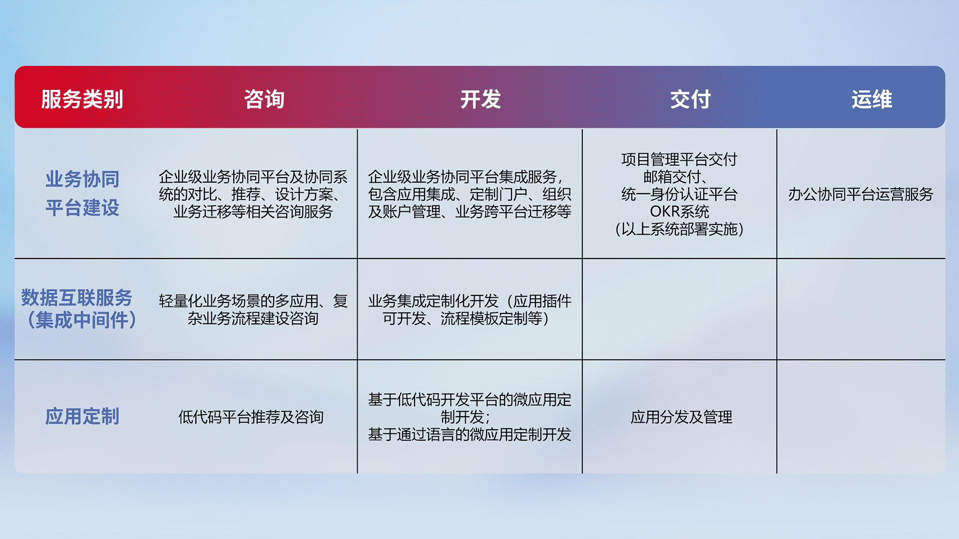 针对钉钉、、、、企微、、IDaas等平台级产品提供产品的规划、、方案、、、交付、、、定制化开发等服务,,,,实现如统一协同办公、、、智能客户服务、、混合会议管理、、、、智能数据查询、、、、等业务场景,,,,实现数字化转型。。